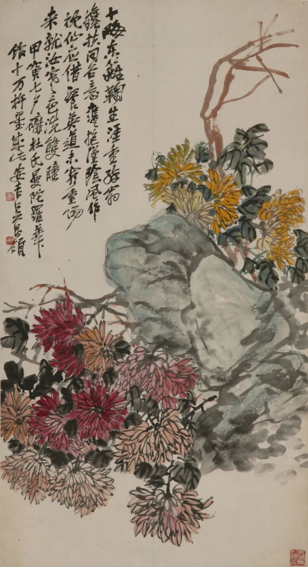 此幅《菊花圖》作于甲寅年(1914年),時(shí)年七十一歲的吳昌碩已步入藝術(shù)巔峰。畫面以對(duì)角斜勢(shì)構(gòu)圖,數(shù)叢菊花自右下向左上舒展,枝干虬曲如篆籀筆法寫就,蒼勁有力,墨色濃淡相生,盡顯金石之氣。花葉俯仰向背,疏密有致,形成“疏可走馬,密不透風(fēng)”的節(jié)奏感。設(shè)色濃麗而不俗,紅、黃、粉、赭交相輝映,卻以墨線勾勒主干、濃墨點(diǎn)葉壓陣,實(shí)現(xiàn)“色不掩墨、墨不壓色”的視覺平衡,艷中見拙,重中有清。