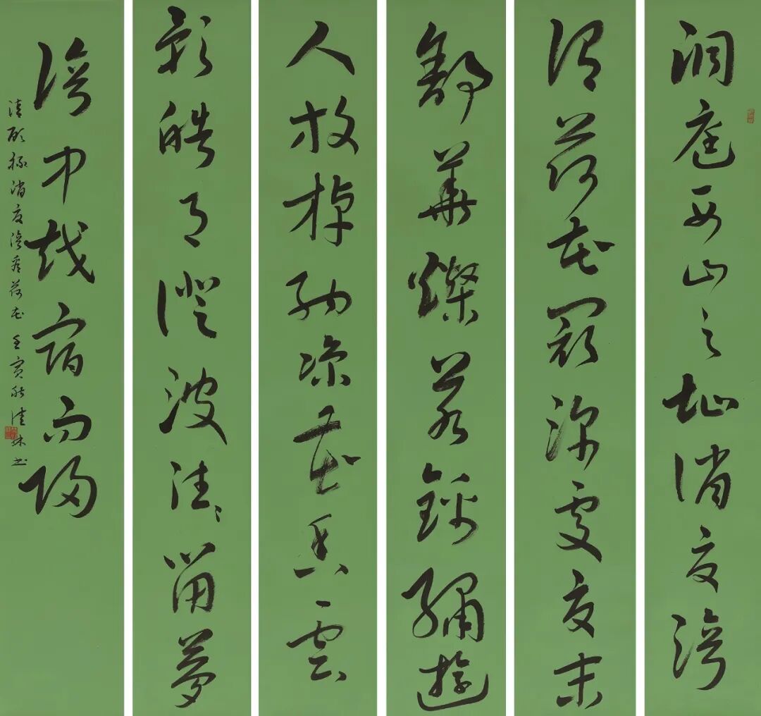 本次展覽是中國美術(shù)館學(xué)術(shù)邀請系列展,展出的15件作品形式豐富,既有條幅、條屏、對聯(lián),亦有冊頁、小品。其中,《蘭亭序》章草六條屏表現(xiàn)章草古拙體勢,意在重新詮釋“天下第一行書”的瀟灑風(fēng)流,妍與拙、柔與剛、秀美與雄強融而為一,并通過豐富的墨色變化帶來意趣盎然的美感。《幽夢影》今草冊頁、《飲酒》小品,法度嚴謹,可見“致廣大而盡精微”,在方寸之間構(gòu)建出靜謐典雅、生機勃勃的藝術(shù)世界。所選文本出自古代詩詞、散文、書論,體現(xiàn)出作者的人文情懷。