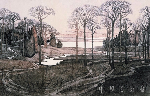 常進(jìn)以獨(dú)特的感知能力在傳統(tǒng)山水畫審美境界與個(gè)人內(nèi)心影像之間構(gòu)建了一個(gè)寂靜的“理想境界”。他作畫細(xì)膩清朗,講究意境,有一種多愁善感的繾綣之情。此外,將古人山水畫中的筆意,化入自己松活幽雅的皴法之中,或加一些揉紙和滴灑技法,都是常進(jìn)的重要突破和格體特征。《秋水無聲》是他轉(zhuǎn)向前述典型畫風(fēng)之前的作品。他在傳統(tǒng)的基礎(chǔ)上添加了一些透視感和色彩感,使傳統(tǒng)格局和三度空間觀念融起來。柔韌悠長的曲線與中鋒、逆鋒等筆法結(jié)合,使線條有了豐富的表現(xiàn)力。畫中的山形和樹形頗為奇特,似有園林奇石之影。常進(jìn),生于1951年,江蘇南京人。1981年畢業(yè)于江蘇省國畫院,后留院從事專業(yè)創(chuàng)作,一級(jí)美術(shù)師。