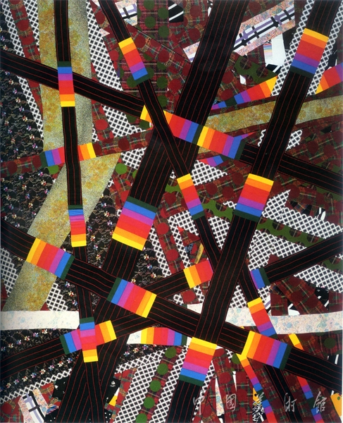 這是一幅極具表現(xiàn)力的裝飾性拼貼畫(huà)。畫(huà)面最底層是紅、白、黑三色的細(xì)碎花布,它們對(duì)比鮮明,密而有序,快樂(lè)活潑,充滿(mǎn)生機(jī)。處于畫(huà)面中間層次的是一些灰色與白色的碎布片——由于它們的存在,整個(gè)畫(huà)面顯得空闊、疏落而富有立體感。畫(huà)面最外層則是幾條橫貫整個(gè)畫(huà)幅的帶有色相變化和細(xì)紅條紋的黑色長(zhǎng)布條,它們與作為底襯的各色碎布相比,顯得很有氣勢(shì)、縱橫開(kāi)闊。