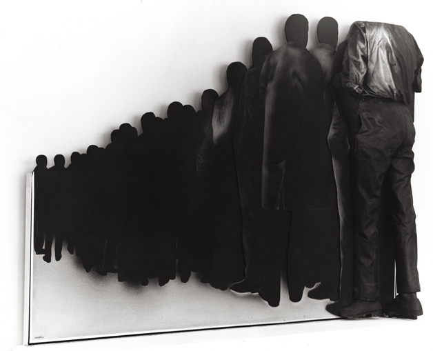 拉斐爾·卡諾加爾,1935年生于托萊多;1956—1966年任加利福尼亞米爾斯學院客座教授;在馬德里生活和工作。畫面上是一隊背朝觀眾的男性形象,且由于透視的原理,人物越往畫面深處越小。最靠近觀者的男人形象超出了畫面之外,他是由聚酯玻璃鋼塑造而成,身上穿著真實的服裝。他身旁的幾個著力描繪的黑白對比明顯的形象顯得較為突出,再往后是幾個靠的更近的人體形象,身體擁擠在一起,但頭與腳的輪廓清晰。所有的人都是背朝外,不見面目,昏暗的畫面籠罩著陰郁的氣氛,這同標題“希望”形成了對比,人們在這群或許是尋找工作機會,或許是等待買東西的人中看不出任何與希望有關的東西。作者在隱喻等待變革。畫面最右邊真人大小的人物形象使得畫外的觀賞者處在畫面人群的末尾位置,從而對等待者的命運有更深的體會而更加關注。作者的目的是借助于生活中常見的場面來增強作品的感染力,使觀眾對生活進行反思。他說:“我的目的是把事物的變化過程顛倒過來——努力把呆板的畫面賦以生命……我把真實變成形象展現(xiàn)在人們面前,以供人使用。” 卡諾加爾的作品具有社會批判性,他展現(xiàn)的多是大城市的生活畫面以及這些生活對人們的影響。他說:“我的作品多表現(xiàn)人,明確地反映工業(yè)社會的人。工業(yè)社會把城市生活變成了奴隸社會,也把人的本質變成了單純維護人的最基本的共同生活和保持友好關系的職能性載體。”