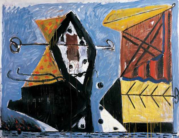 馬爾庫(kù)斯·呂佩茨,1941年生于勒伯勒克(波西米亞);1948年隨家庭逃往西方;1956年至1961年就學(xué)于克勒菲爾德和杜塞爾多夫藝術(shù)學(xué)院;1961年以來(lái),自由職業(yè)藝術(shù)家;1987年以來(lái),任杜塞爾多夫國(guó)家藝術(shù)學(xué)院院長(zhǎng);在柏林和杜塞爾多夫生活和工作。在畫面的左邊可以看到一個(gè)黑白橢圓形形狀的東西,緊靠著它的是一個(gè)黃色的類似蝴蝶的形體。一個(gè)棕色的物體占據(jù)畫面的右邊,它與海灘篷椅結(jié)合在一起,再往下是勾畫得十分簡(jiǎn)單的一條魚的骨頭。盡管沒(méi)有任何形式來(lái)闡明這一點(diǎn),但這幅畫仍含有具體的特點(diǎn)。就畫面和裝飾線來(lái)說(shuō),畫的構(gòu)思并不模仿自然。馬爾庫(kù)斯?呂佩茨在其靜物畫中,發(fā)展了這些虛構(gòu)的形式,并對(duì)具體物體做了說(shuō)明。他本人就談?wù)撨^(guò)“抽象概念的客體化”問(wèn)題。此外,呂佩茨還就靜物畫問(wèn)題與其他藝術(shù)家(如畢加索)進(jìn)行過(guò)深入的探討,并使他們同意自己的看法。這幅畫來(lái)自一個(gè)五部分的靜物畫系列。在這個(gè)系列中,呂佩茨詳細(xì)地描繪了幾個(gè)形體的死亡。其中,在左邊一半的畫面中,只有微小的變化,而在右半邊的畫面也有不同的改變。在標(biāo)題中所提到的死亡,是通過(guò)一個(gè)特定的細(xì)節(jié)勾畫出來(lái)的,比如這幅畫里的魚骨。呂佩茨是戰(zhàn)后重要的德國(guó)畫家之一。他們能在抽象派占優(yōu)勢(shì)地位的很長(zhǎng)時(shí)期內(nèi)發(fā)展了自己獨(dú)立的繪畫風(fēng)格。他們不否認(rèn)自己的德國(guó)國(guó)籍,而是有意識(shí)地將其包含在自己的作品內(nèi)。